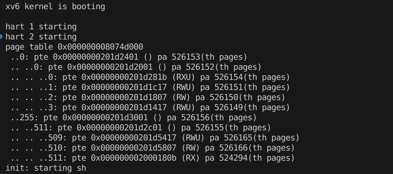 ptePrint(pagetable, 2, 0); // 从根页表开始 递归遍历和打印